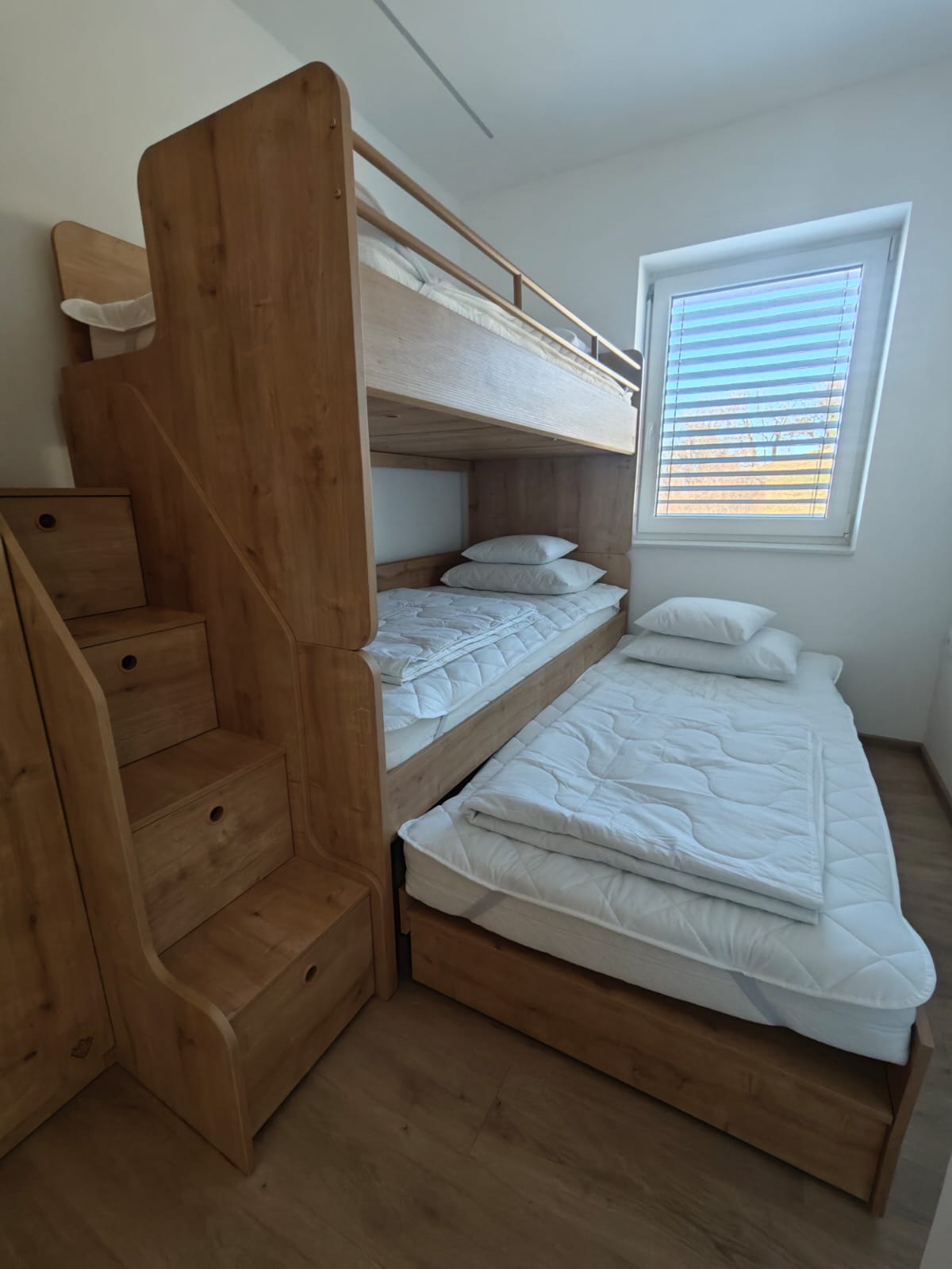 Zamaknjen pograd Compactos popolnoma prilagojen po meri. Stranka si je izbrala naravne odtenke lesa.