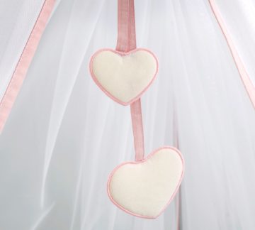 Baldahin Little Love odlično ide uz krevece, čiji su dušeci dimenzije 50×100 cm i 60×120 cm. Dostupan je u bijeloj boji s ružičastim dodacima.