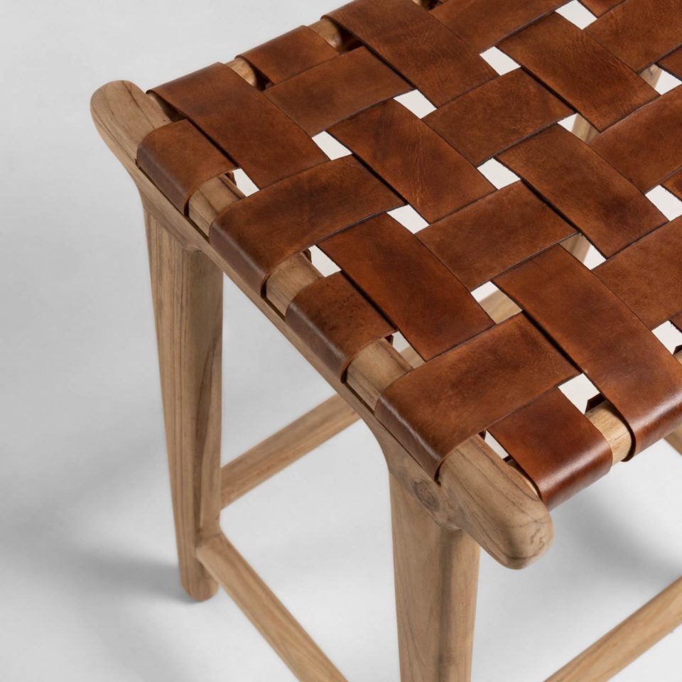 Drvena barska stolica Calixta idealan je izbor za ljubitelje unikatnog i prirodnog stila. Zaubljenu konstrukciju, izrađenu od masivnog drva tikovine, vizualno dopunjuju pleteni kožni traci.