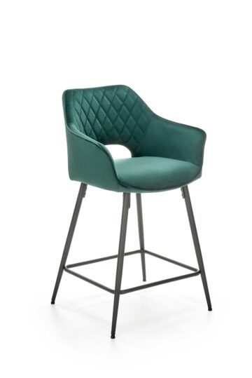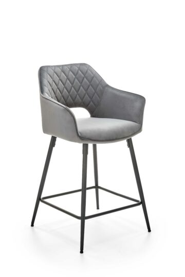 Metalna barska stolica H106 odlikuje se udobnim i elegantnim dizajnom. Sastavljaju ju praškasto lakirano čelično postolje i sjedište sa naslonom, obučeno u baršunastu tkaninu. Dobavljiva je u sivoj i zelenoj verziji.