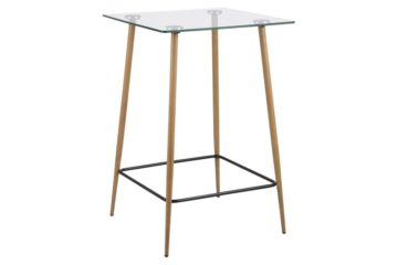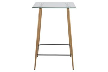 Barski stol Wilma je modernog izgleda. Ploća je staklena, debljine 10 mm. Podnožje je metalno ali bojano na izgled hrasta-