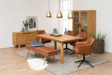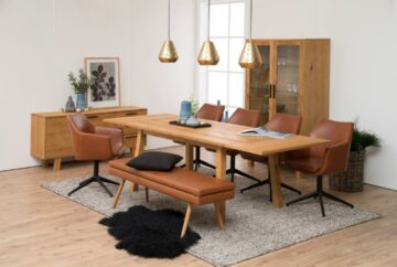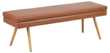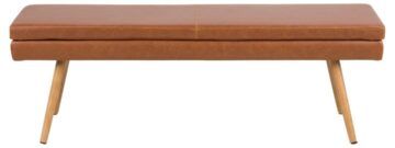 Blagovaonska klupa Nora sadrži sjedište izrađeno iz eko kože u brandy boji. Postolje je izrađeno iz hrastovog drveta, tretiranog uljima.