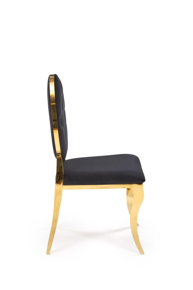 Unesite u svoj dom dašak prestiža i modernog glamura s blagovaonskom stolicom K556. Ovaj izuzetan komad namještaja spaja eleganciju crnog baršuna sa sjajnim zlatnim okvirom, stvarajući ambijent luksuza i udobnosti koji će očarati svakog posjetitelja i podići vašu blagovaonicu na novu razinu.