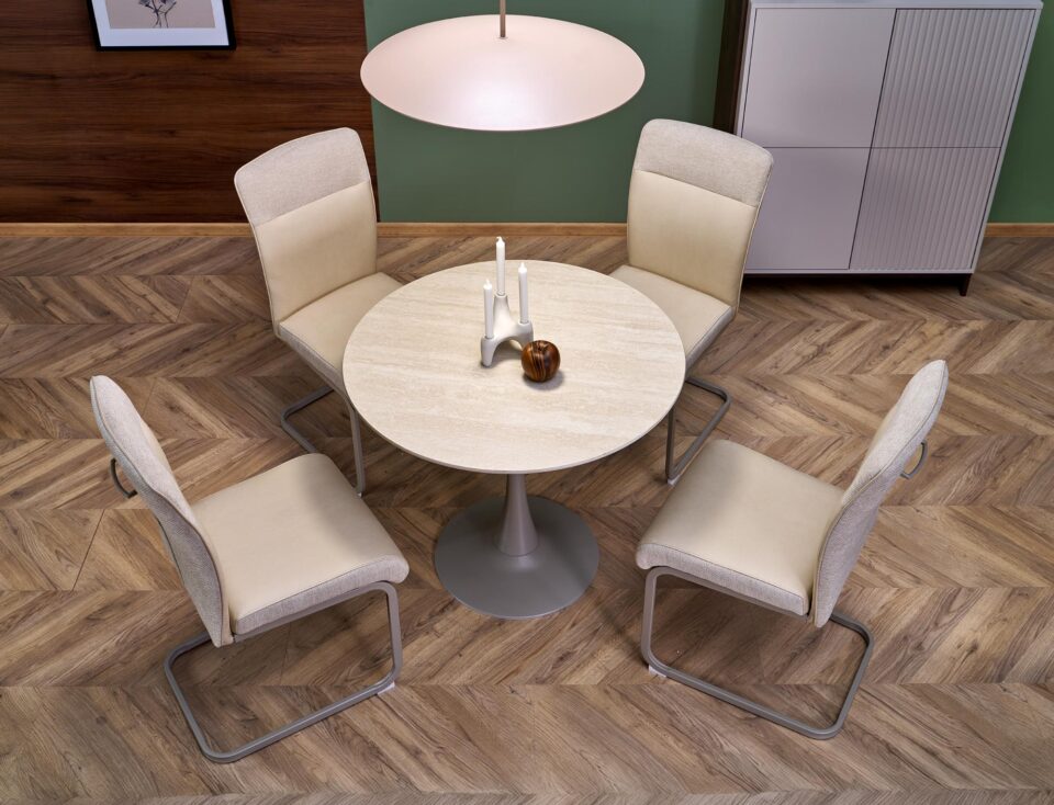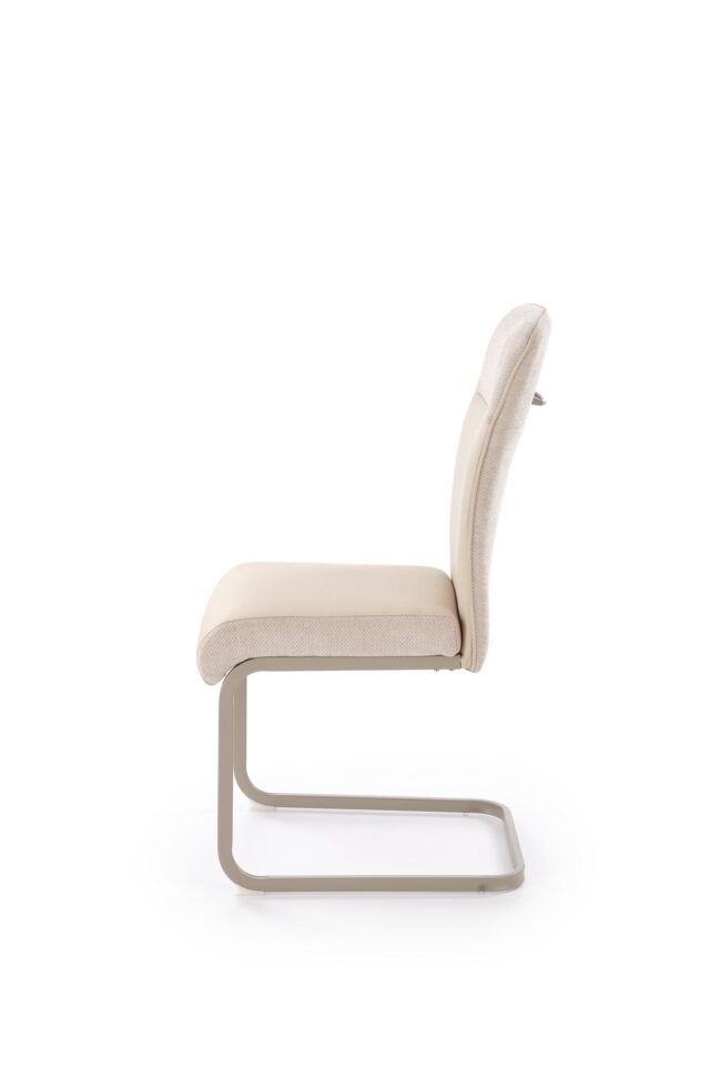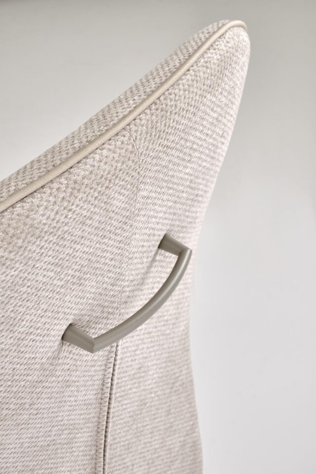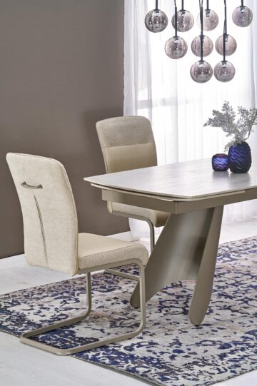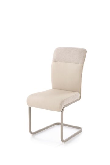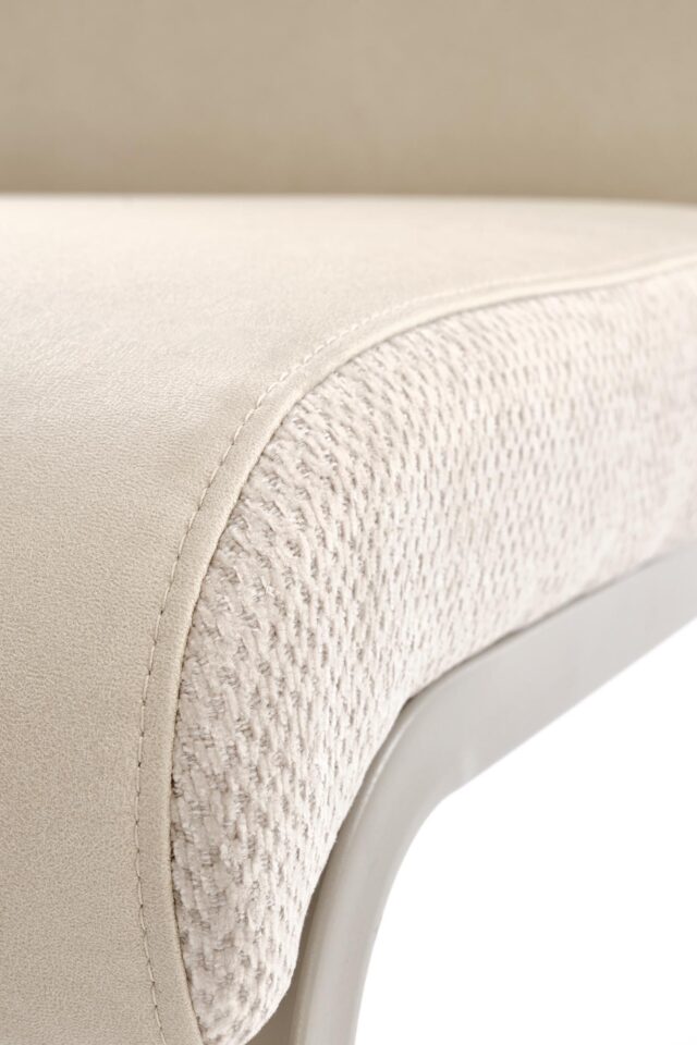 Stolicu odlikuje promišljena kombinacija materijala – sjedalo je presvučeno visokokvalitetnom tkaninom i eko kožom, što osigurava ugodan osjećaj pri sjedenju i lako se održava. Nježna bež nijansa (kašmir) donosi toplinu i sofisticiran izgled koji se lijepo slaže s raznim shemama boja prostorije.