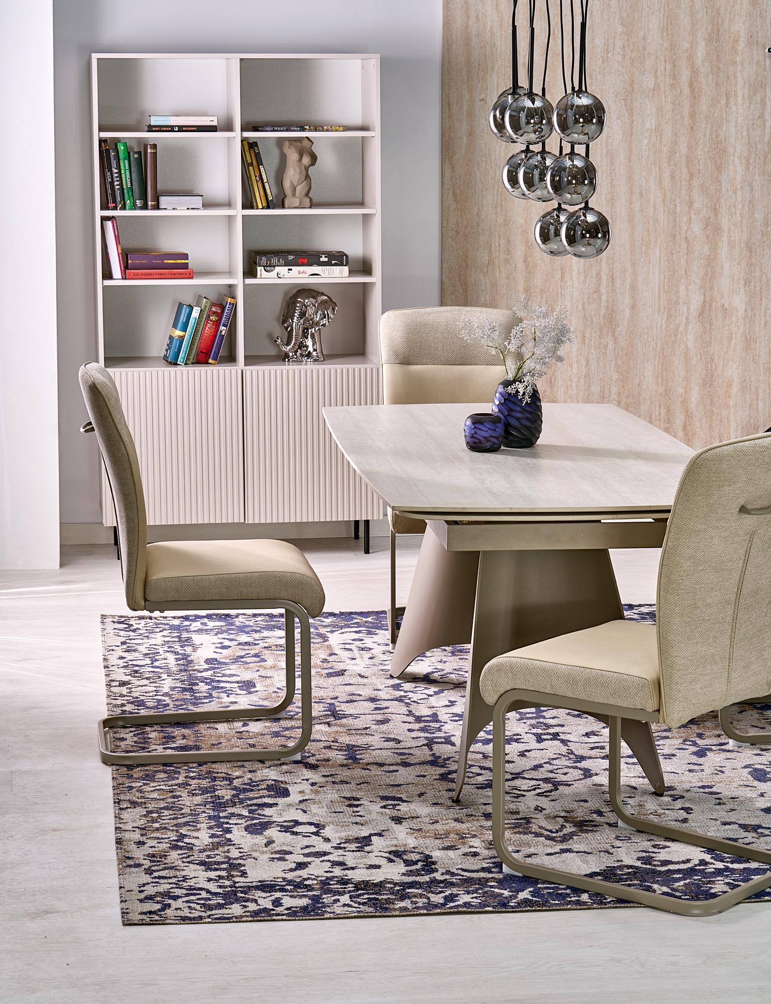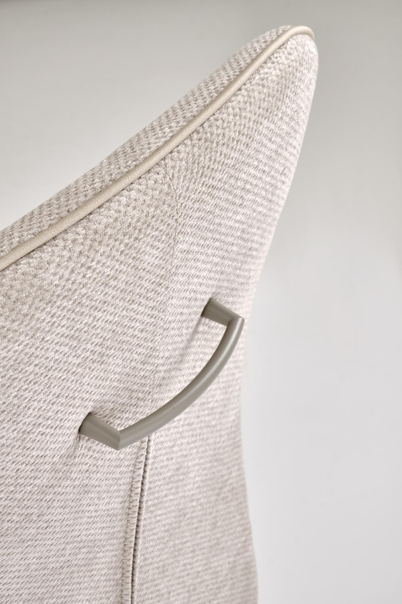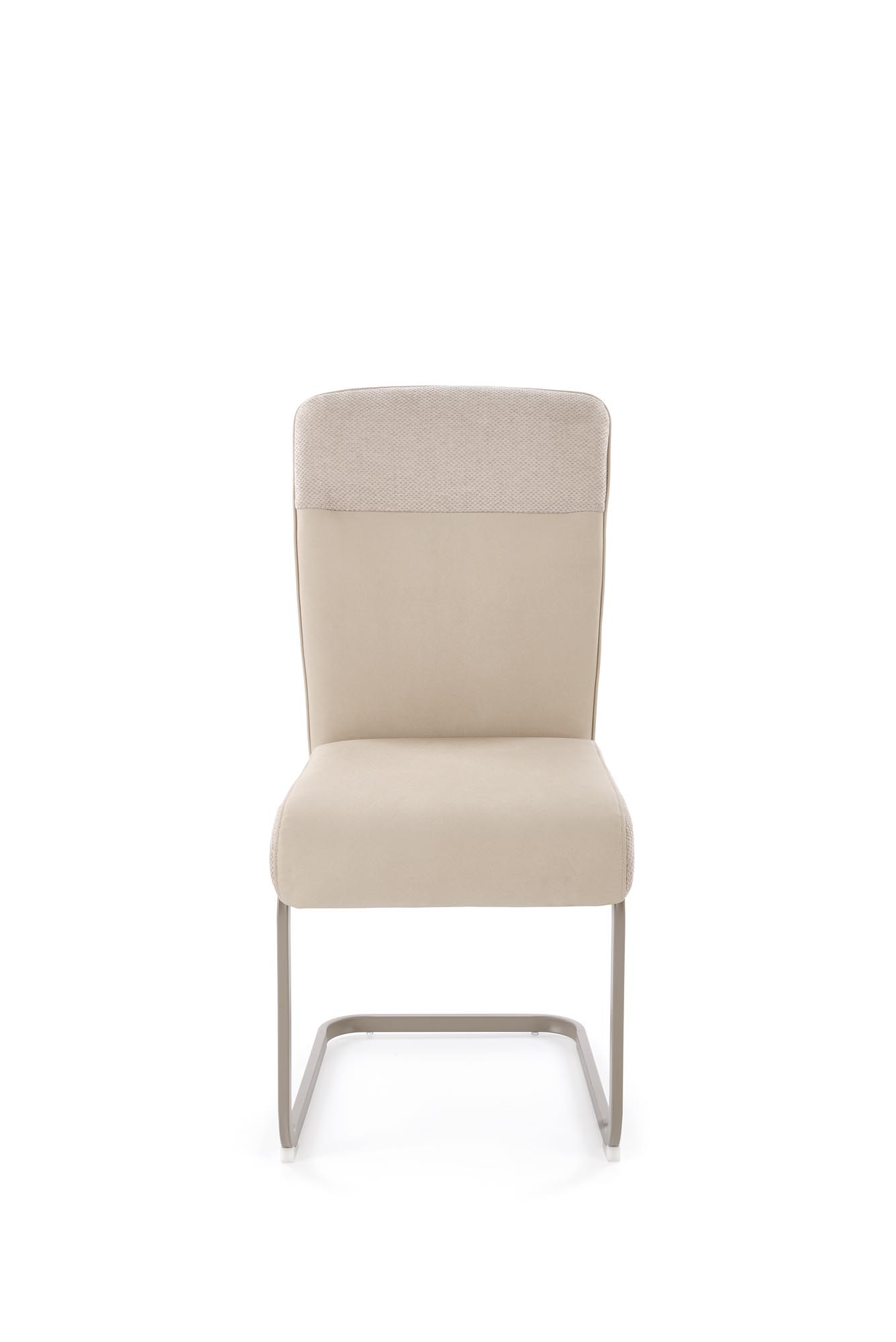 Stolicu odlikuje promišljena kombinacija materijala – sjedalo je presvučeno visokokvalitetnom tkaninom i eko kožom, što osigurava ugodan osjećaj pri sjedenju i lako se održava. Nježna bež nijansa (kašmir) donosi toplinu i sofisticiran izgled koji se lijepo slaže s raznim shemama boja prostorije.
