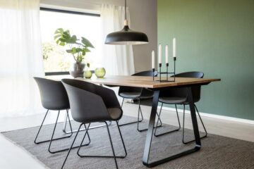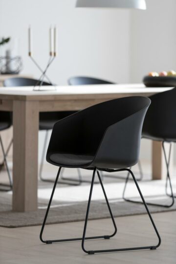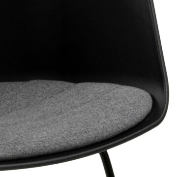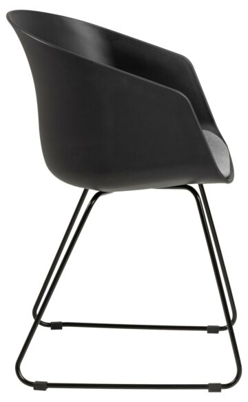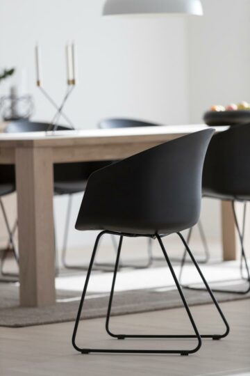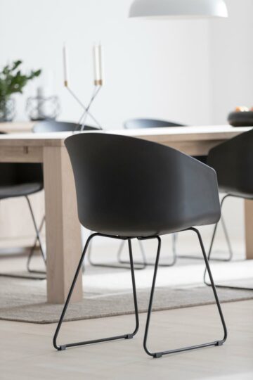 Plastična blagovaonska stolica Moon sa svojim polukružnim dizajnom pobrinut će se da je stolica upotrebljiva kao i naslonjač ili obična stolica za urede, čekaone, salone ili slično. Stolica je sastavljena iz okvira izrađenog iz umjetne mase, koji uključuje jastuk u sivoj boji. Okvir stola na odabir je u crnoj ili bijeloj boji. Postolje je izrađeno iz bijelo pigmentiranog hrasta.