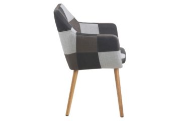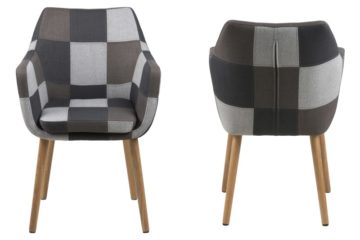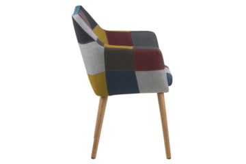 Blagovaonska stolica Nora obučena je u tkaninu u “patchwork”stilu. Možete izabrati između sive palete boja ili šarene. Podnožje je od punog hrasta tretiranog s prirodnim uljem.