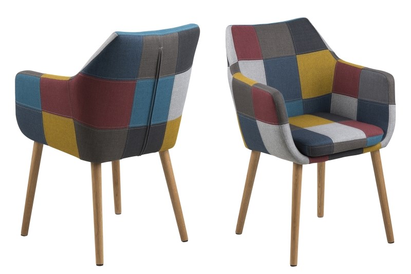 Blagovaonska stolica Nora obučena je u tkaninu u “patchwork”stilu. Možete izabrati između sive palete boja ili šarene. Podnožje je od punog hrasta tretiranog s prirodnim uljem.