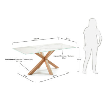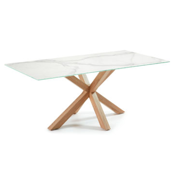 Elegantan blagovaonski stol Arya dolazi u kombinaciji bijele boje i postolja drvenog izgleda. Izrađen je od visokokvalitetnog porucalana sa podporom od stakla. Noge izrađene su od nehrđavog čelika. Dostupan je u dvije dimenzije.