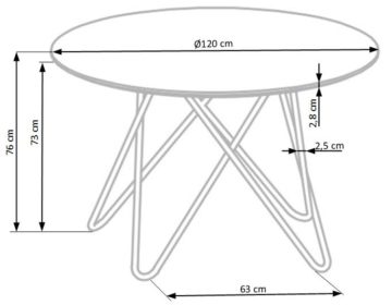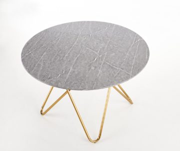Okrugli blagovaonski stol Bonello prepliće se sa gornjom pločom izrađenom iz MDF-mediapana u nijansi sivog mramora, sa kromiranim podnožjem u zlatoj boji. Zbog svojih dimenzija može se upotrjebiti kao Okrugli blagovaonski stol ili kao stol za terasu ili vrt.