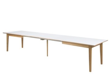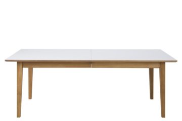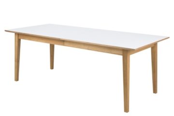Blagovaonski stol Calla napravljen je od lakiranog masivnog hrastovog drva u natur boji. Gornja površina napravljena je od bijelog HPL (laminata). Uz doplatu možete kupiti i produžetak za stol dimenzije 45 x 100 x 2.5 cm.