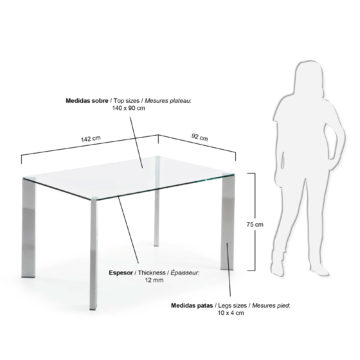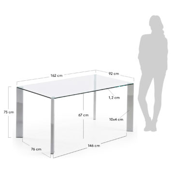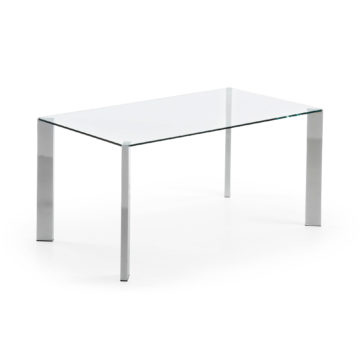 Blagovaonski stol Corner je elegantnog izgleda, a odlikuju ga ravne i čiste linije. Izrađen je od stakla, a nogice su od kromiranog čelika. Stol je jednostavan za čiščenje, te visok 75 cm. Birati možete između 2 dimenzije: 160 x 90 cm i 140 x 90 cm.