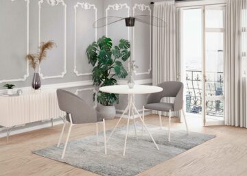 - Ploča stola izrađena od medijapana u bijelom mat dekoru, noge stola su metalik lakirane u mat crnoj boji