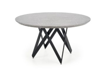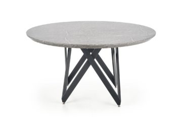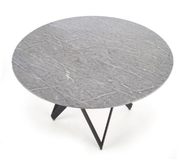 Okrugli blagovaonski stol Gustimo sadrži preplitajuče crno podnožje izrađeno iz čvrstog čelika. Gornja površina izrađena je iz visokokvalitetnog laminiranog MDF-mediapana i obojana u prekrasnu nijansu sivog mramora.