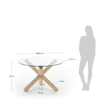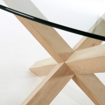 Okrugli Okrugli blagovaonski stol Nori odlikuje se modernim dizajnom, posebno vidljivim u postolju oblikovanom u x, te kvalitetnom izradom od masivnog drveta i stakla. Nijansa izbjeljenog hrasta značajno pridonosi elegantnom izgledu.