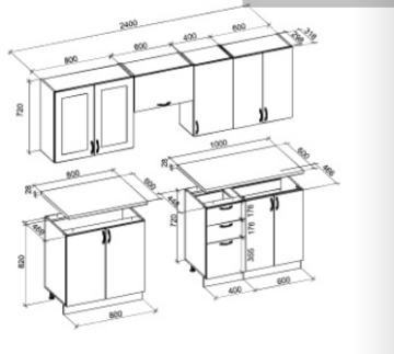 Širina gornjih ormara redom: ormar s dvojim staklenim vratima 80 cm, ormar širine 60 cm za napu, ormar s vratima 40 cm i ormar s dvokrilnim vratima širine 60 cm.