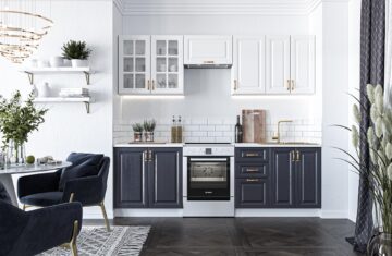Gornji ormarići u bijeloj boji dodaju lakoću i vizualno proširuju prostor, dok tamno mornarsko plava boja donjih ormarića dodaje jedinstvenu dubinu i karakter interijeru. Zlatne ručke savršen su naglasak, donoseći dašak luksuza i suptilne sofisticiranosti cijelom kompletu.