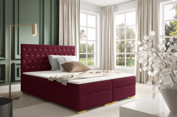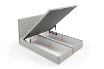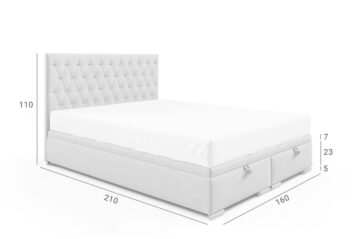 Boxspring krevet Mojca 2 je dizajniran s iznimno čvrstim okvirom koji osigurava dug vijek trajanja i udobnost. Pogodan je kako za hotele, tako i za kućne spavaće sobe, zahvaljujući vrhunskoj izradi koju cijene brojni kupci. Krevet uključuje visoko tapecirano uzglavlje, dvije praktične kutije za pohranu posteljine te drveni okvir koji se otvara uz pomoć plinskih amortizera, omogućujući jednostavan pristup prostoru za pohranu. Stranice kreveta obložene su pjenom i presvučene dekorativnom tkaninom po vašem izboru. Za dimenzije kreveta, molimo pogledajte tehnički crtež. Možete birati između više dimenzija:
