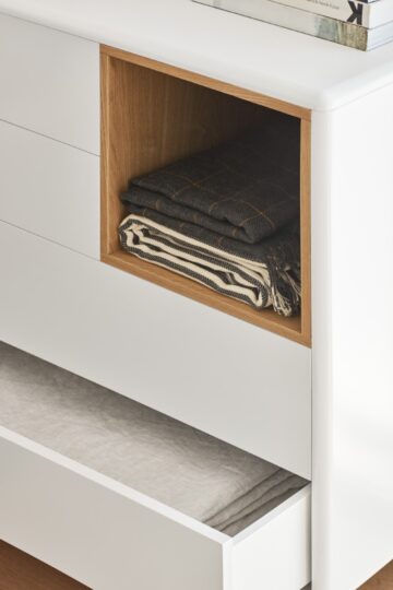 Komoda Corvo spaja profinjeni dizajn s nježno zaobljenim siluetama, stvarajući namještaj s volumenom i modernim karakterom. Kombinacija mat lakiranog MDF-a u biserno sivoj, krem ili antracit boji i detalja od prirodnog hrasta daje ovoj komodi elegantan i prirodan kontrast.