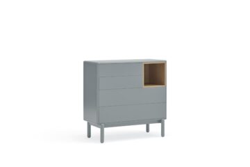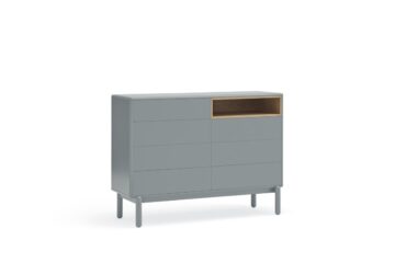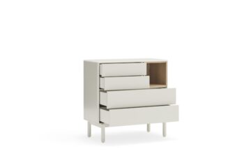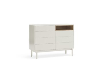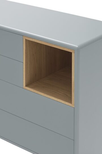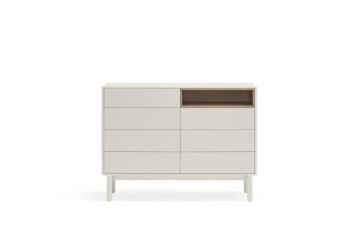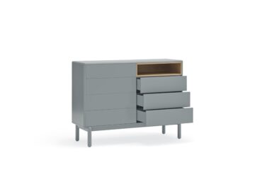 Komoda Corvo savršena je za spavaće sobe, dnevne sobe ili hodnike, gdje želite kombinirati funkcionalnost i suvremeni dizajn. Njen neutralni biserno sivi ton lako se uklapa u razne stilove interijera.