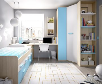 Dječja soba je na slici prikazana u kombinaciji hrastovine, bijele i tirkizne boje.