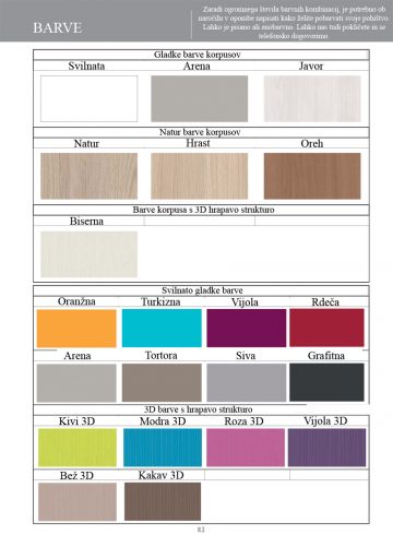 Možete promijeniti boje ili ih ostaviti onakve kakve jesu. Paletu boja možete pronaći u dodatnim slikama. Recite nam svoju željenu kombinaciju boja u poruci za narudžbu, ili nas kontaktirajte putem telefona. Sastav se može prilagoditi Vašim željama. Na primjer: možete dodati ormar iz drugog sastava i zamijeniti ga s postojećim. Ako vam se stvarno sviđa dizajn, ali nijedan od sastava Vam ne odgovara, nazovite nas i pronaći ćemo rješenje zajedno.