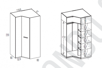 • Kutni ormar, dimenzije 116 x 220 x 97 cm. Ormar je ispunjen policama s desne strane, a lijeva strana ima veliku fiksnu policu s vješalicom.