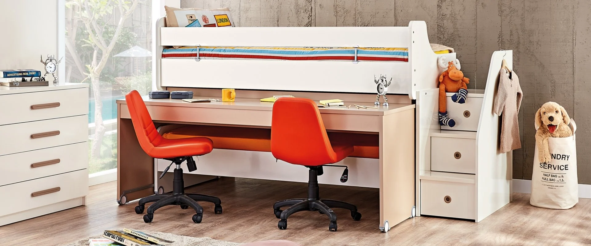 Dječja soba Happy savršeno je rješenje za optimalno iskorištavanje prostora i funkcionalnost u manjim sobama. Povišeni krevet na kat nudi siguran i udoban prostor za spavanje, s nosivošću do 130 kg, što osigurava trajnost i stabilnost. Ispod kreveta se nalazi izvlačni pisaći stol, koji omogućuje udoban prostor za učenje i stvaranje, zajedno s dodatnim izvlačnim krevetom, idealnim za goste ili kao dodatni dječji krevet.