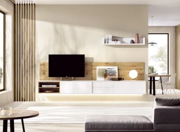 Dnevni boravak Compactos 22 potpuno je modularan i svojim minimalističkim izgledom savršeno se uklapa u svaki stil dnevnog boravka. Sastav je prikazan u nijansama Blanco Poro i Nordic.