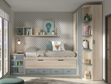 Moderna dječja i mladenačka soba Compactos F017 za manje prostore s puno iskorištenog skladišnog prostora na maloj površini. Compactos namještaj može se prilagoditi vašem prostoru. U cijenu je također uključena dostava i montaža. Tijelo: AMBAR Fronte: AMBAR, OCEANO Ručke: CIRKUS Sve boje možete vidjeti uživo ovdje u Brežicama. Što sadrži set za dječju sobu Compactos F017?