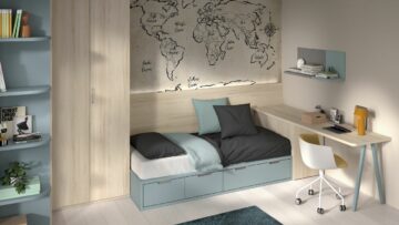 - Knjižni poličar na garderobnom ormaru Krevet s četiri ladice koje se meko zatvaraju. Na krevet stane madrac 90 x 190, 90 x 200 ili 100 x 200.