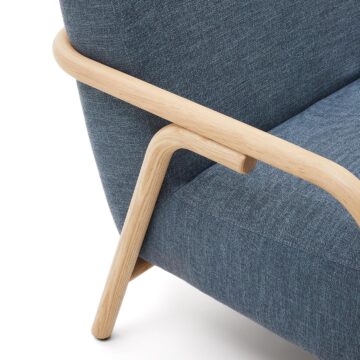 Fotelja Sylo u plavoj boji izrađena je od masivnog jasenovog drva s FSC 100% certifikatom, što jamči korištenje održivih materijala. Njegova struktura uključuje poliuretansku pjenu za udobno sjedenje, dok kombinacija jasen furnira i tkanine doprinosi estetskoj vrijednosti i trajnosti.