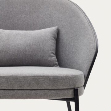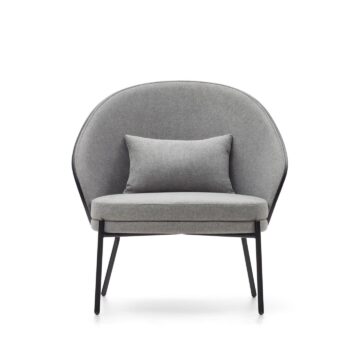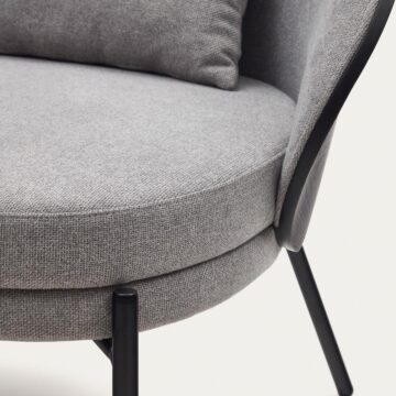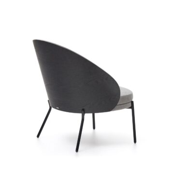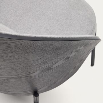 Fotelja Eamy u sivoj boji kombinira furnir jasena s crnim završetkom, crni metal i tapeciranje, stvarajući sklad između prirodne estetike i suvremene funkcionalnosti. Fotelja je obložena mekanim tkaninama koje pružaju udobno sjedenje, dok drvena konstrukcija osigurava stabilnost i dugotrajnost.
