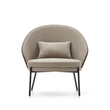Fotelja Eamy u smeđoj boji kombinira jasenov furnir, tapeciranje i metal, stvarajući sklad između prirodne estetike i suvremene funkcionalnosti. Obložena je mekanim tkaninama koje pružaju udobno sjedenje, dok drvena konstrukcija osigurava stabilnost i dugotrajnost.