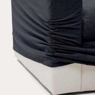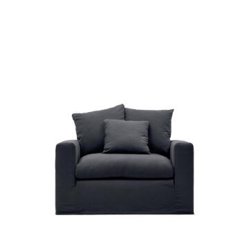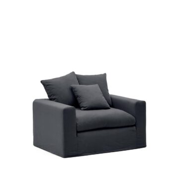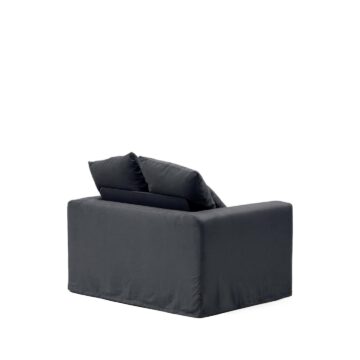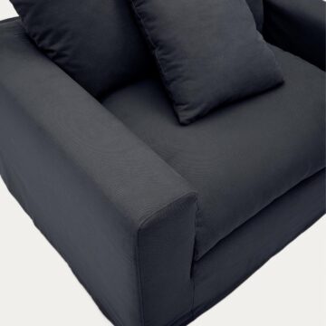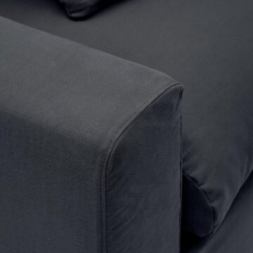 Fotelja Nora u sivoj – antracit boji – 140 cm odiše ravnim linijama i prirodnom elegancijom. Izrađena je od kvalitetnih materijala, uključujući borovo drvo, poliuretansku pjenu, reciklirana vlakna i tkaninu. Jastuci su ispunjeni mekanim pjenastim česticama i recikliranim PET vlaknima, što omogućuje iznimno udobno sjedenje.
