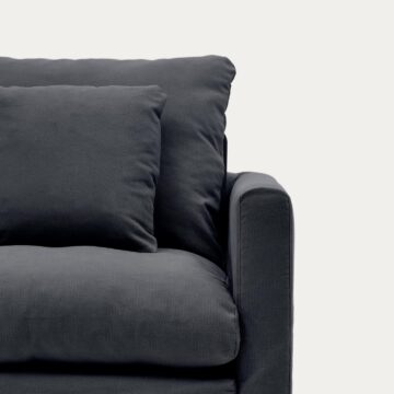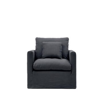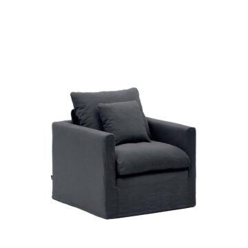 Fotelja Nora s jastukom u sivoj boji – 92 cm osmišljena je s naglaskom na udobnost i funkcionalnost. Njezina antracitno siva nijansa lako se uklapa u različite stilove interijera, dok su presvlake od lana i pamuka ugodne na dodir i otporne na svakodnevnu upotrebu.
