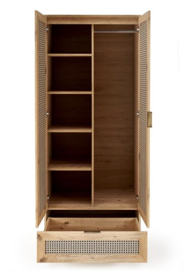 Ormar Borneo u boji hrasta artisan spaja moderan stil s boho toplinom. Čiste linije, naglašeni kontrasti i tekstura drva stvaraju jedinstven vizualni efekt koji se ističe u svakoj spavaćoj sobi. Unatoč širini, nudi dovoljno prostora za pohranu odjeće i dodataka. Idealan je za sve koji traže praktičnost, estetiku i dašak prirode u jednom komadu namještaja.