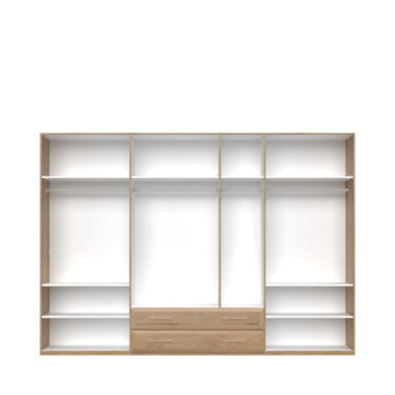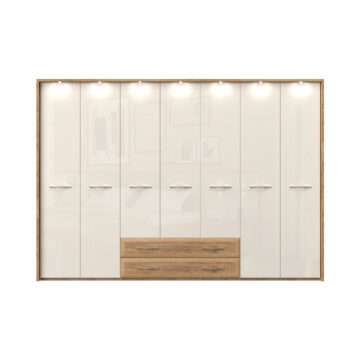 Ormar Gala P72B/GL ima sedam većih polica i jednu manju te četiri šipke za vješanje unutra. Na dnu ormarića nalaze se dvije ladice na meko zatvaranje u boji pacifičkog oraha Korpus je u boji pacifičkog oraha, a vrata su od medijapana u bež boji, lakirana UV lakom koji osigurava 99,70. % pokrivenost i otpornost na habanje i udarce također ima LED osvjetljenje. Moguće je dodati veće ili manje police uz nadoplatu.