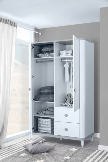 Prostran garderobni ormar Grey odlikuje se elegantnim izgledom i umirenom sivo-bijelom kombinacijom. Ima više polica i šipke za vješalice sa LED svjetlom. Ladice i vrata operiraju na mehanizam tihog zatvaranja. Izrađen je od oplemenjene iverne ploče, zaštićene ABS rubnom trakom.
