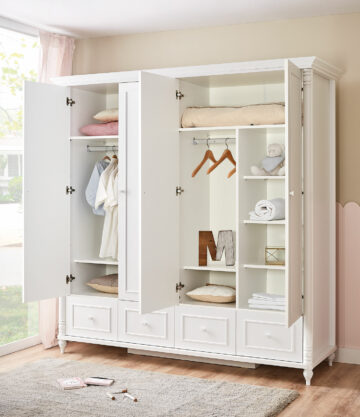 Garderobni ormar Lancastre oblikovan u duhu viktorijanskog je stila, kojeg elegantan izgled ispunjen prilagodljivim bijelim je finišom. Ima tri ladice na meko i tiho zatvaranje te šipke za vješalice sa LED svjetlom. Izrađen je od oplemenjene iverne ploče E1 kvalitete i PVC mase.