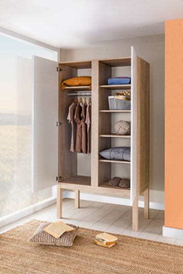 Garderobni ormar Lermo odlikuje se trendovskim izgledom. Prostran i suvremen dizajn uključuje više polica i šipku za vješalice sa LED svjetlom. Vrata imaju ugrađen mehanizam tihog zatvaranja. Izrađen je od oplemenjene iverne ploče, njezine rubove štiti ABS rubna traka.