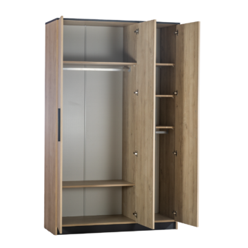 Garderobni ormar Milano odlikuje se elegantnim izgledom. Prostran i suvremen dizajn uključuje više polica i šipku za vješalice sa LED svjetlom. Vrata imaju ugrađen mehanizam tihog zatvaranja. Izrađen je od oplemenjene iverne ploče i metala. Rubove štiti ABS rubna traka.