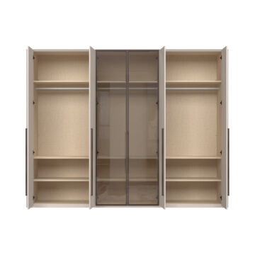 Ormar ima četiri puna i dvoja staklena vrata. Stakleni dijelovi izrađeni su od 4 mm Parsol stakla, uokvirenog aluminijskim profilom u boji Midnight Copper, što prostoru daje luksuzan dojam i omogućuje djelomičan uvid u sadržaj ormara. Dekorativni stup od MDF-a, lakiran u istoj kašmir boji kao i korpus, dodatno naglašava njegov zaobljen i profinjen karakter.