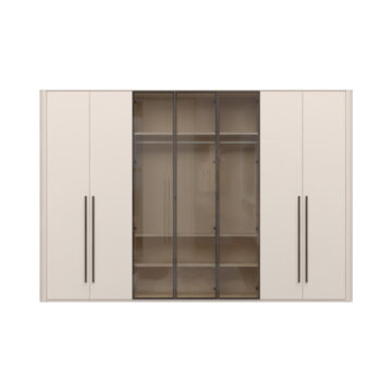 Ormar ima četiri puna i troja staklena krila. Stakleni dijelovi izrađeni su od 4 mm Parsol stakla, uokvireni aluminijskim okvirom u boji Midnight Copper, što prostoru dodaje dašak luksuza i omogućuje djelomičan uvid u unutrašnjost ormara. Dekorativni stup od MDF-a, lakiran u istoj boji kašmira kao i korpus, dodatno naglašava njegov zaobljen i profinjen izgled.