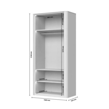 Unutrašnjost ormara osmišljena je funkcionalno: sadrži 3 prostrane police i 1 garderobnu šipku za vješanje odjeće. Ormar je opremljen soft-close sustavom zatvaranja vrata, podesivim nožicama i visokokvalitetnim okovima koji osiguravaju dugotrajnu i tihu upotrebu.
