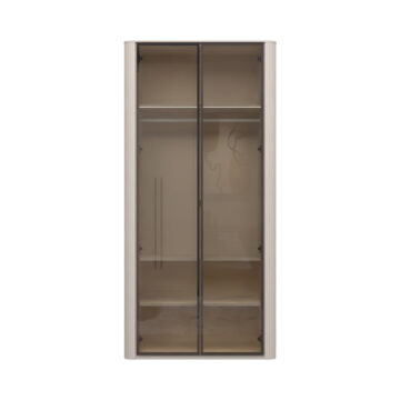 Garderobni ormar RONDO sa staklenim vratima spaja profinjenu eleganciju s funkcionalnošću i naglašava estetsku dovršenost suvremene spavaće sobe. Kombinacija prozirnog Parsol stakla, aluminijskog okvira u boji Midnight Copper i meko matiranog kašmir dekora čini ovaj ormar luksuznim komadom namještaja s izraženim dojmom sofisticiranosti.