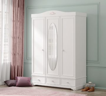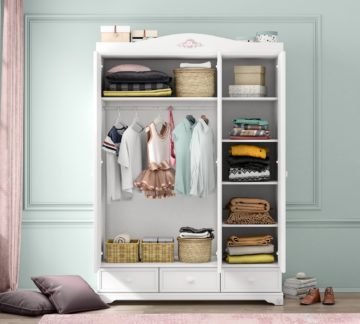 Garderobni ormar Rustic White je dostupan u bezvremenskoj bijeloj boji sa rustikalnim dodacima. Sastoji se od tri vrata, koja se tiho zatvaraju, a unutra su police i vješalica. Na dnu su tri ladice, koje se također tiho zatvaraju. Ormar pruža dovoljno prostora za pohranu sve odjeće vaše bebe. Zaštićen je sa melaminom, koji je otporan na ogrebotine i prljavštinu.
