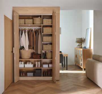 Njegova klizno-preklopna vrata imaju sustav tihog zatvaranja i sklapaju se poput harmonike, što omogućuje potpun pristup unutrašnjosti. Zauzimaju manje dubine, pa se ormar može postaviti bliže krevetu.