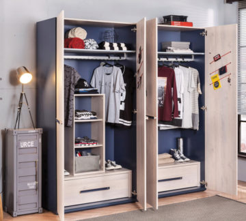 Garderobni ormar Trio je izuzetno dubok i dobro iskorišten. Zbog toga pruža dovoljno prostora za pohranu sve vaše odjeće. Ima dvoja vrata, koja se tiho zatvaraju, brojne police, ladicu i vješalicu sa svjetlom. Sa prednje strane ima četiri žice na koje možete pričvrstiti ili objesiti nešto. Zaštićen je sa melaminom, koji štiti od ogrebotina i prašine.