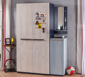 Garderobni ormar Trio je mali i se koristi kao dodatak ormaru iste linije kao što je prikazano na slici. Ima tri praktične police. Drška je urezana v vratima, koja se tiho zatvaraju. Pruža dodatni prostor za pohranu vaše odjeće. Zaštićen je sa melaminom, koji štiti od ogrebotina i prašine.